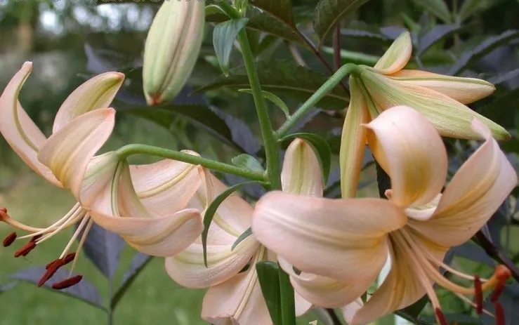 Fls soft apricot over ivory giving a fawn-buff shade, tepal- tips darker, centre dark satin-green; spots absent; pollen brown; stigma tan. Stems 1 m, with up to 20 fls. July Blooms, Three feet tall- Sun to dappled light Plant three times the length of your delivered dormant lily bulb.