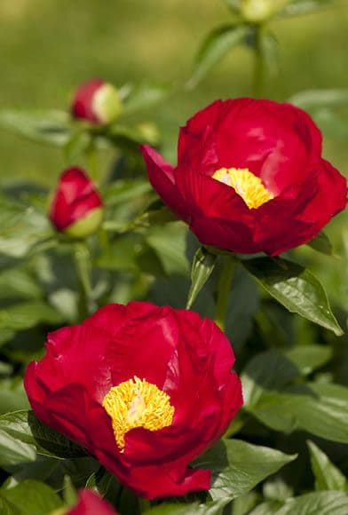 Paeonia ‘America’ is widely considered to be the finest single red-flowered peony ever introduced. This very vigorous 1976 Nathan Rudolph hybrid is an early mid-season peony that produces an abundance of exceptionally sturdy stems, each topped with lightly fragrant, single red flowers, each accented by a central bouquet of yellow stamens. Paeonia ‘America’ was awarded the American Peony Society Gold Medal in 1992 and the Award of Landscape Merit in 2009…a true winner! Truly ‘America’ a single crepe paper bloom, will have many stop and ask you for the name. One of a kind and a very vigorous display in just a few short seasons.