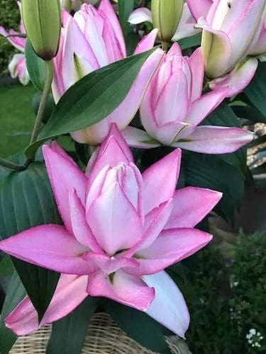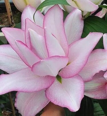 ‘Anouska’ Roselily™️ is exquisitely a beauty. This double blast reveals its fascinating fully double white blossoms that are kissed with a pink sweetheart edge. This heavy bloomer has several layers of multiple rows of ruffles and wavy tepals that will surely cause a ruckus in the gardens for show and grace. I love cutting these heavenly fragrant perfume blooms and bring them inside for my designs and arrangements. This Roselily Series is one of many that we are offering here this season for all. The rarity of this double blast variety will have you wanting many more. They truly have become an outstanding specimen and conversation piece within my display gardens. I have these in planters for late blooming contrast of color and fragrance