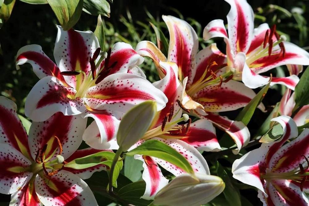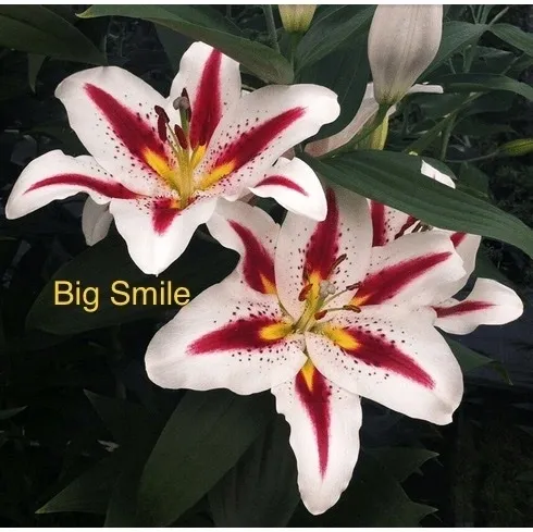 ‘Big Smile‘ Orientals are nothing short of offering you a Big Smile when you gaze upon them. Grand and glorious with steady stems and fragrance. Sure to draw attention to gazers and pollinators. This Tricolor accented blossom will definitely give you a ‘BIG SMILE’. The kaleidoscope pinwheel adds texture and dimension to the gardens displays . The flowers are 5 inches across and the fragrance is delightful. The wonderment of the colors welcome the waning of summer and add charm to the fall surrender of appeal, coordinating to the red, maize of the beginning of the new fall wonderment.