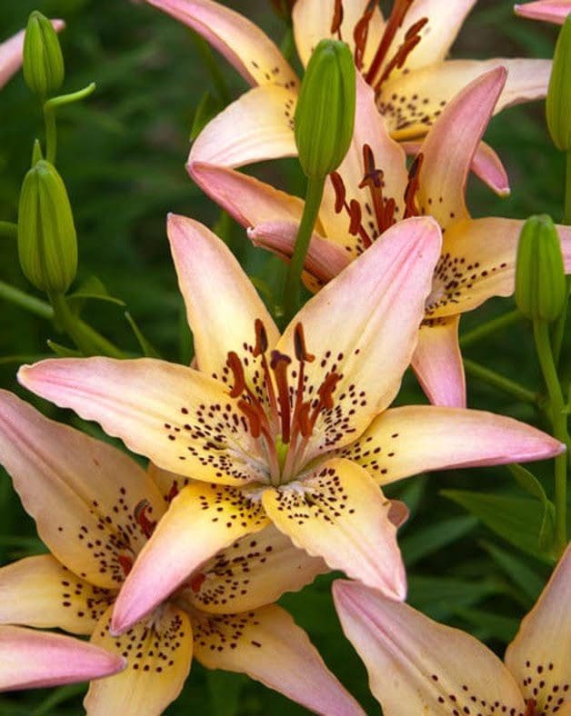 ‘Bismuza’   provides a unique blend of brilliance to the gardens and/or arrangements. Known for its high bud count , this showstopper will have you head over heels with the delight of this one of a kind pastel beauty. With the outlined dusted pink edges, and the deep accents of the dark freckles, one will be happy to have this vigorous multiplier in the gardens. Glowing strong as a “Stellar Light”, this is one that will shine brightly in your gardens from season after season.