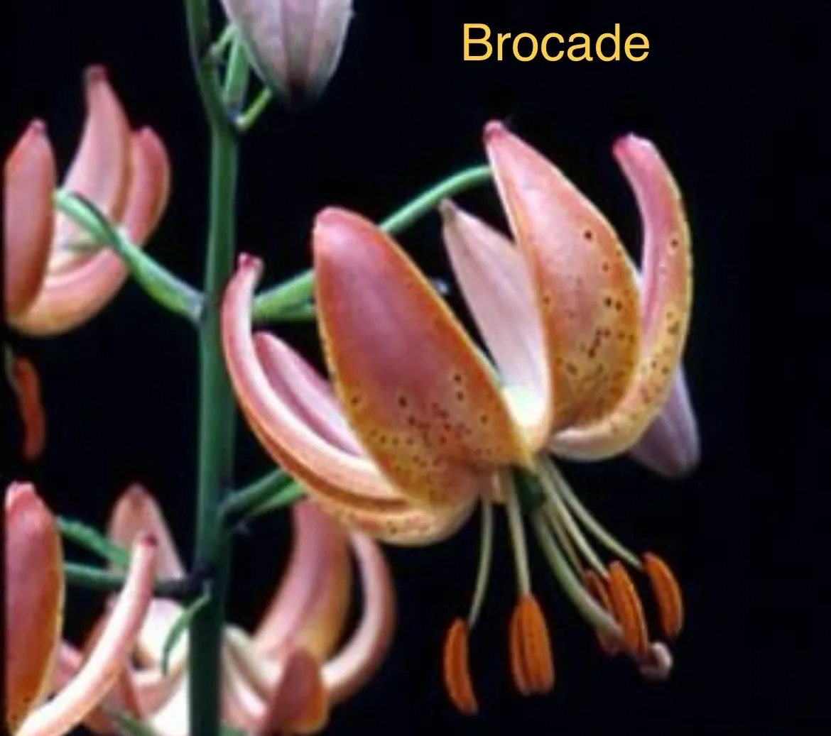 L. x dalhansonii ‘Brocade’ cv. (Selection from Backhouse Hybrids) R:&N: Backhouse, before 1923. Wallace cat.: 3 (1923). Orange-yellow, suffused rosy pink, spotted chocolate. Stems 1.5m. June. Arose as a sport. Complex lineage .. The last time this was offered was three seasons ago. I have now a few more available. This is a hard martagon to find here in the states.