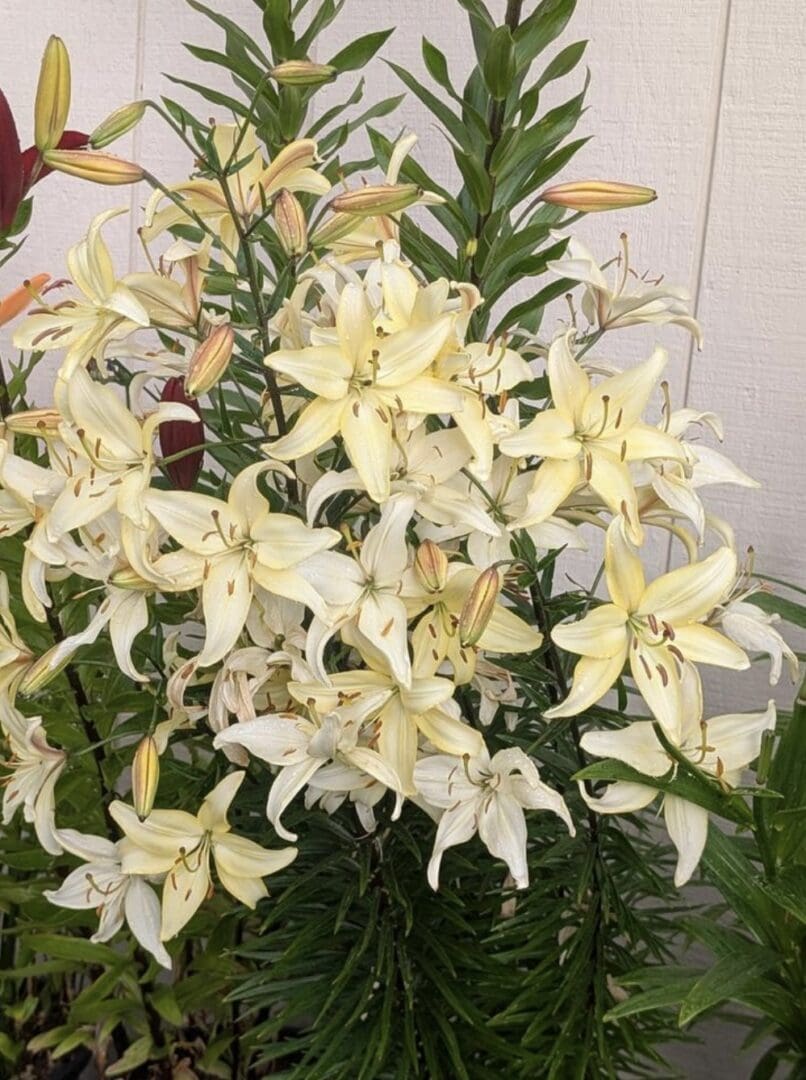 Parentage: ‘Albipayne’ X ‘Bingo’. A stunning historic for the gardens…. R: L.D. Marshall (1977), G: Columbia-Platte Lilies (1980), N: Columbia-Platte Lilies (1980), I: Columbia- Platte Lilies (1988), REG: Columbia-Platte Lilies (1988) Inside pale yellow (in very cool weather) to pure white, tepal-tips with a slight pink flush in very cool weather, throat white; outside pale yellow to white, overlaid with light plum along midribs; spots absent; nectaries green-white; pollen orange, anthers either not opening or only partially dehiscing. Tepals 60-90 × 30 mm, margins smooth, tips strongly recurved. Lvs scattered, 100-150 × 20-30 mm, dark green. Stems 1- 1.8 m, dark green with a plum overlay, and with 7-15 fls (including many secondary buds). Late June.