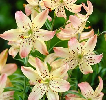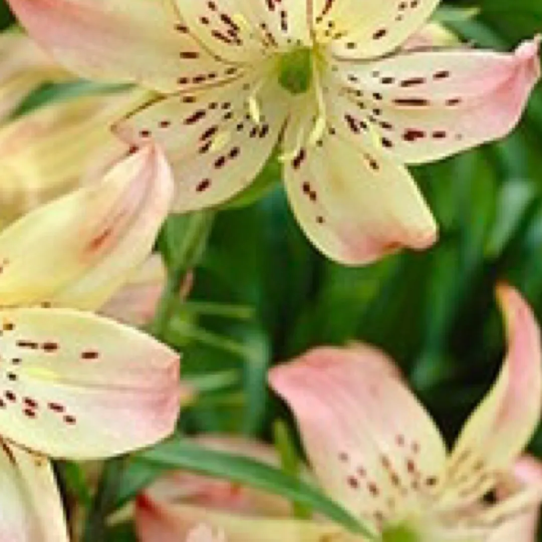 Inside pale pink, with a white centre; outside yellowish ivory and rose-pink; pollen absent; spots tiny, deep maroon, on basal half of each tepal; stigma pink. Stems 1.2 m. July. (Published in ILR (1969).)