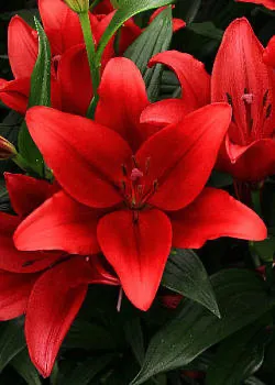 LONGIFLORUM ASIATIC, STEMS ARE STRONG AND THE FLOWERS HUGE, FORMING NICE SIZE COLONIES IN NO TIME. the red is so intense it is on fire. The center seems to shine a darker glow, giving this a place all of its own in the gardens. This blood red is extremely stately. LAs BLOOM LATER IN THE SEASON GIVING TREMENDOUS FALL EXTENDED COLOR WITHIN THE GARDENS. No fragrance and each stem can hold 6-8 flowers