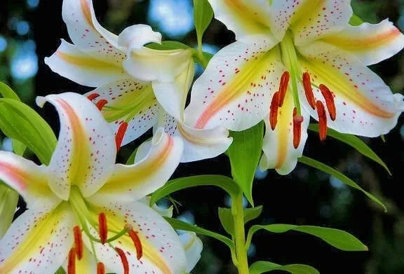 Garden Party Oriental. 6.00 or 3/15 is a true carnival of color with flowers in deep yellow and the mid rib rising from the base and changing to red half way to the tips. Lightly spotted features a party event for sure!!! stunning display, Enjoy that this is a shorter variety getting about two feet tall. So … up front and center they are and the display is smashing….. blooms are 6 inches wide and are fully loaded with perfumed fragrance that awakens the senses