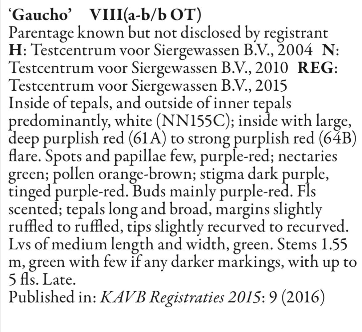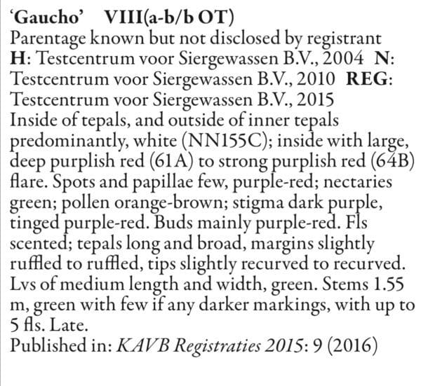 Gaucho OT is one that I can’t explain. The brush stroke within each petal of the blossom causes the most unusual of markings. This grows strong and has the perfect fragrance on the mid summer evenings. There is nothing subtle about this Oriental-Trumpet lily. The flowers are enormous with their two-tone color. Bold, dramatic and fantastic. The fragrance will be soft and lingering on a summers eve. The tepals are thick, the attraction is seductive — I have many of these for the later bloom season that they offer in my season of summer into the beginning of the autumn splendor.Â