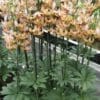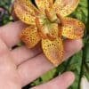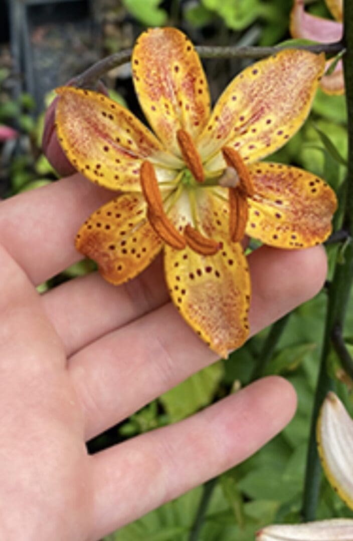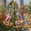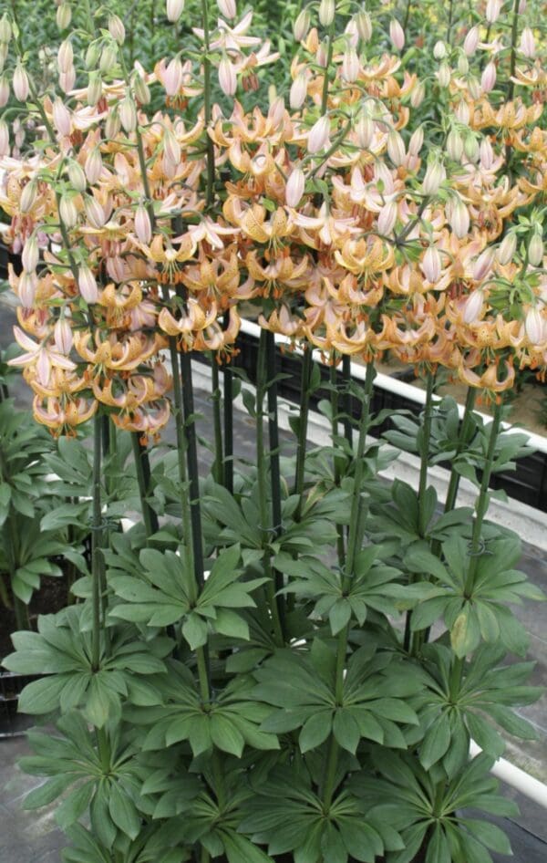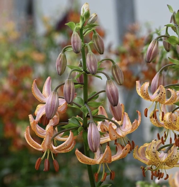 ‘Guinea Gold’ Martagon Lily Registered and Named by Frank Skinner pre 40’s. This has the most charming sunset-rich caramel colored flowers, speckled with cinnamon. It has the classic Martagon candelabra form with small nodding turk’s cap flowers and whorled leaves. Interesting pink buds. This lily is somewhat reminiscent of the old Mrs. R.O. Backhouse’s winsome habit, which is now extinct in commercial distribution.’Guinea Gold’ Martagon Lily was derived from L. martagon crossed with various Asian native species, such as L. Hansonii. Quite shade tolerant, tall and very floriferous. Remember, Martagons may not come up the FIRST year, as they are busy down below forming those perennial roots. Very interesting lineage and definitely and oldie but goodie . The last season that this was offered was 2022. These are not commercially available but I do have a few to offer this season as they have increased nicely. Take a peek at HgG sibling site where you will see further photos as they emerge and bloom. https://minnesotamartagonlilies.com/guinea-gold-dalhansonii/