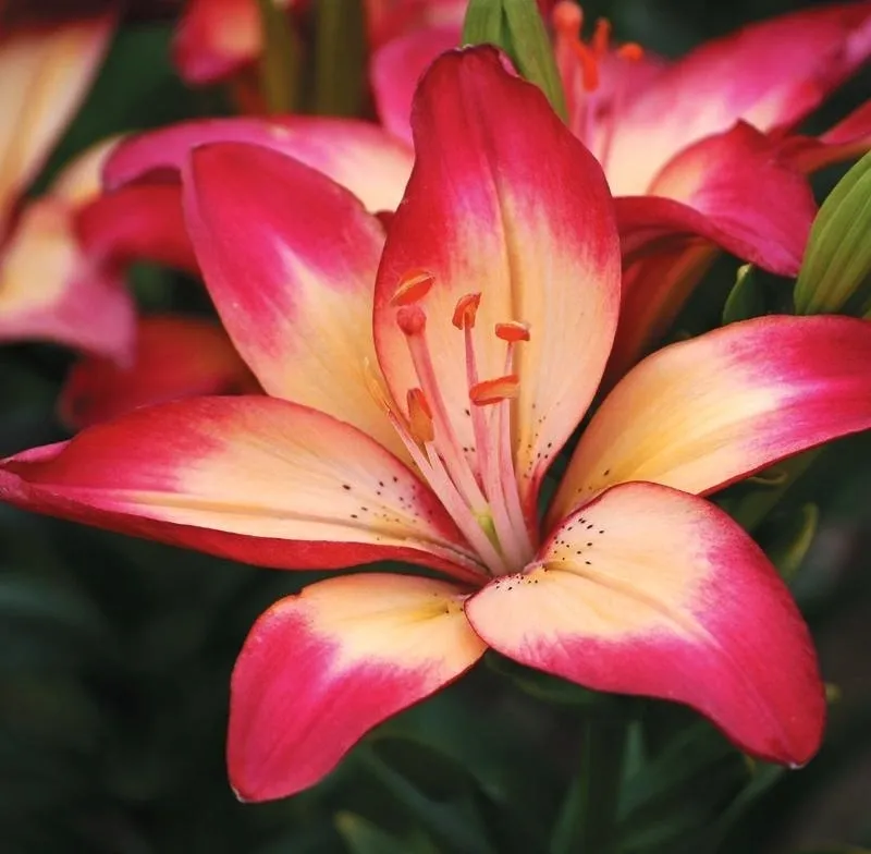 This Asiatic Lily truly pushes the midsummer color scheme with its sherbet-colored stars enhanced by broad yellow halos that are intricately detailed with freckles. I have had this now for the second year in a row as it sells out quick. This truly will tug at your heart!! These bulbs are rather huge and I have had to dig an extra wide hole for these just to fit.
