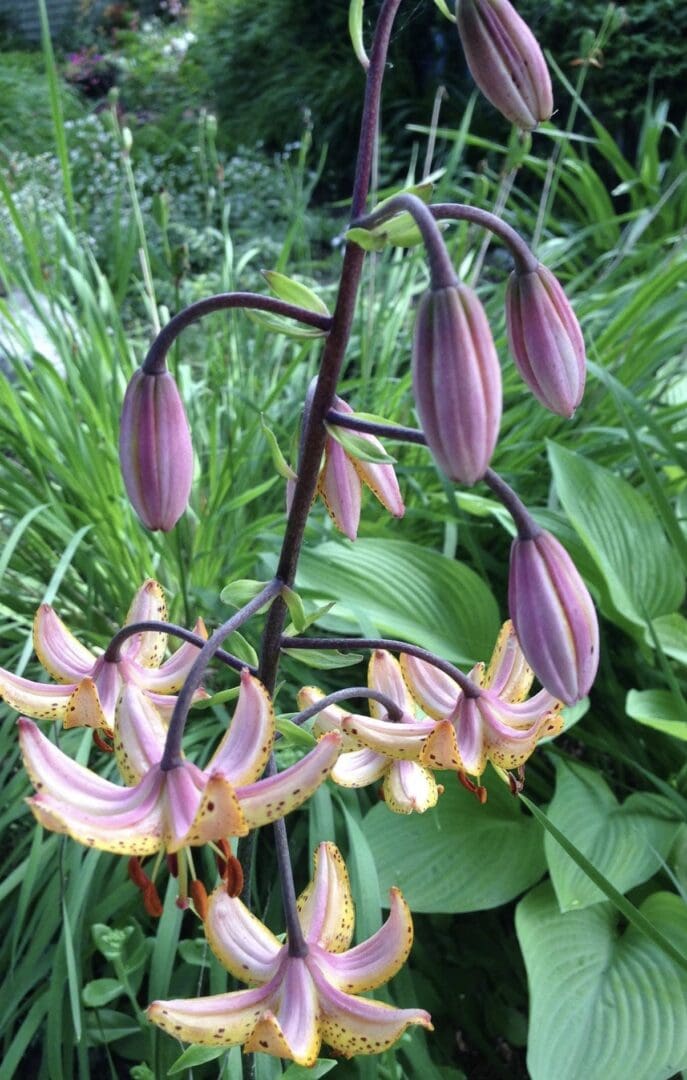 Inside yellow, blushed pink, throat pale yellow; outsidepink in bud, opening with a pink stripe on each tepal; spots many, large, mostly in the centre of each tepal;nectaries pale yellow; pollen orange. Fls 70 mm wide; tepals 35 × 15 mm, margins smooth, tips slightly recurved. Lvs whorled, 160 × 35 mm, mid green. Stems over 1.2 m, brown-spotted, and c.40 fls of very heavy substance. Truly a classic for the gardens. Planting these in-between the hosta and astilbe make a statement in the design of the gardens.