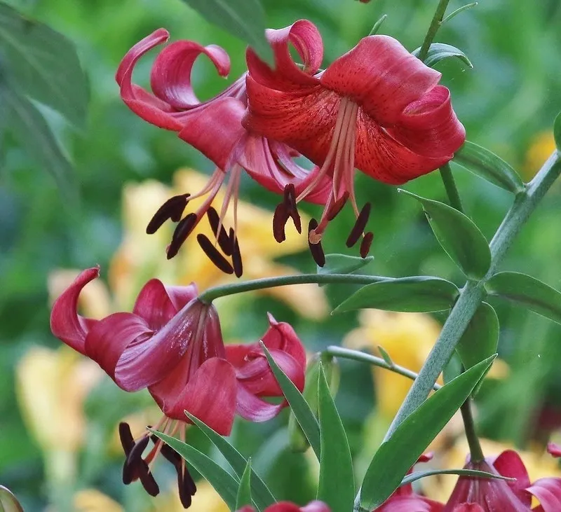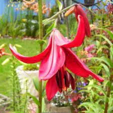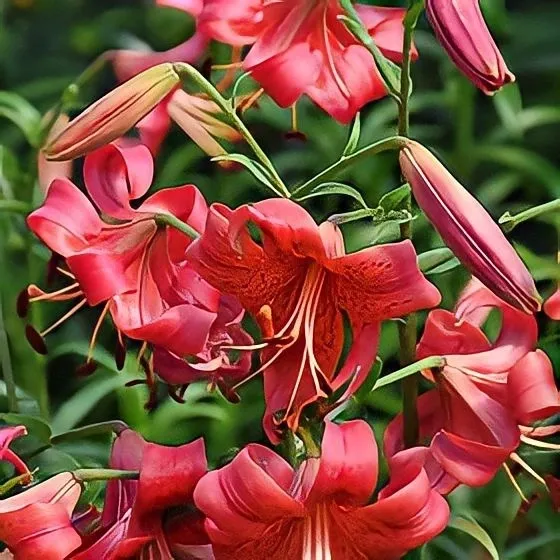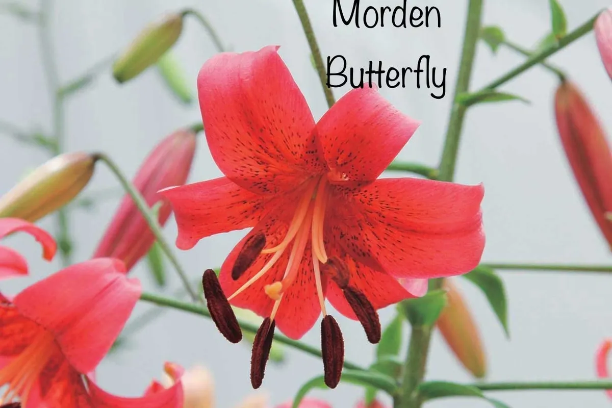 Morden Butterfly Ronald 1975. Here an Asiatic that is side facing grows with such beauty and grace. The stems are the perfect shade of green with a flower that the petals curl back, exposing birthmarks in the interior of the soft melon red throat. This one blooms over a period of time with the secondary buds that bloom later. The contrast of the pollen is remarkable. 4 feet tall, Blooms June and the lighting for this is filtered sunshine or full sunlight