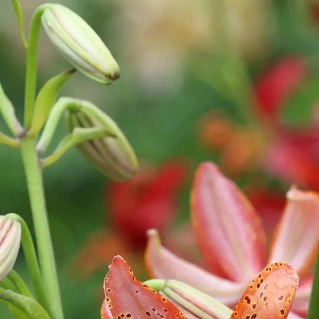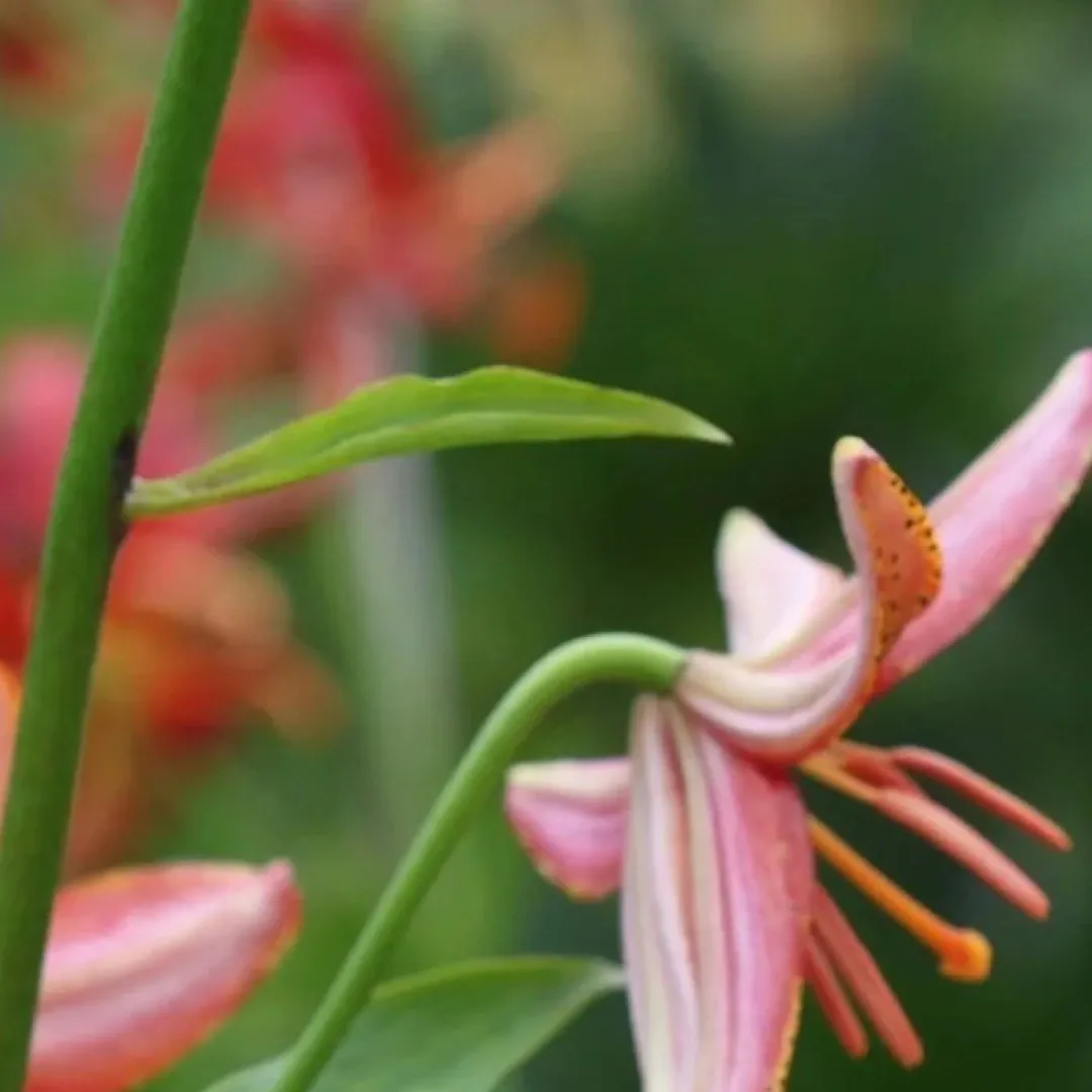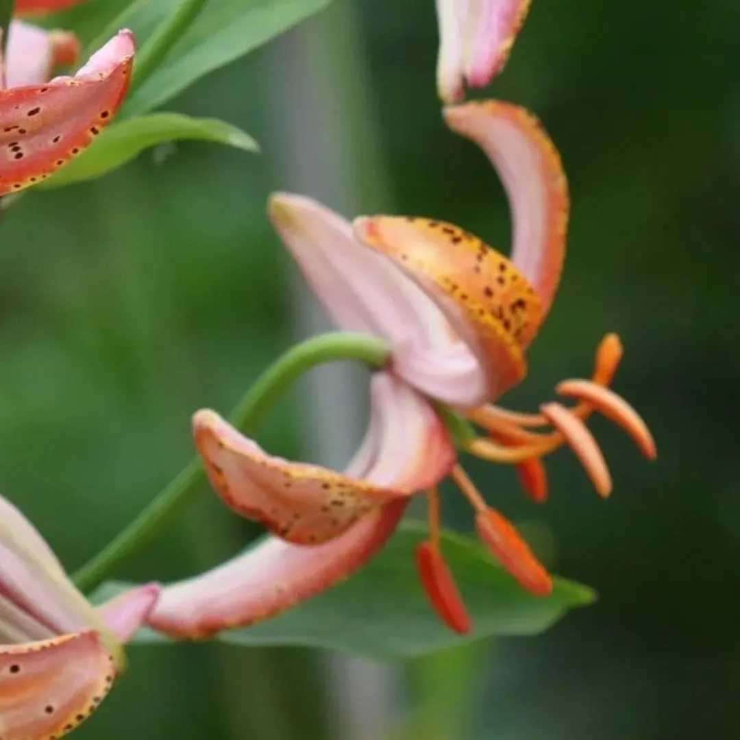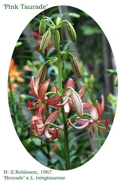 cv. (‘Brocade’ x L. tsingtauense) H: E.Robinson, 1967 N:&I:1981 Reg:1988. Pink, tinged yellow, tips white, throat pink, outside light pink; spots lilac on yellow surrounded by yellow; nectaries reddish; pollen brown.
