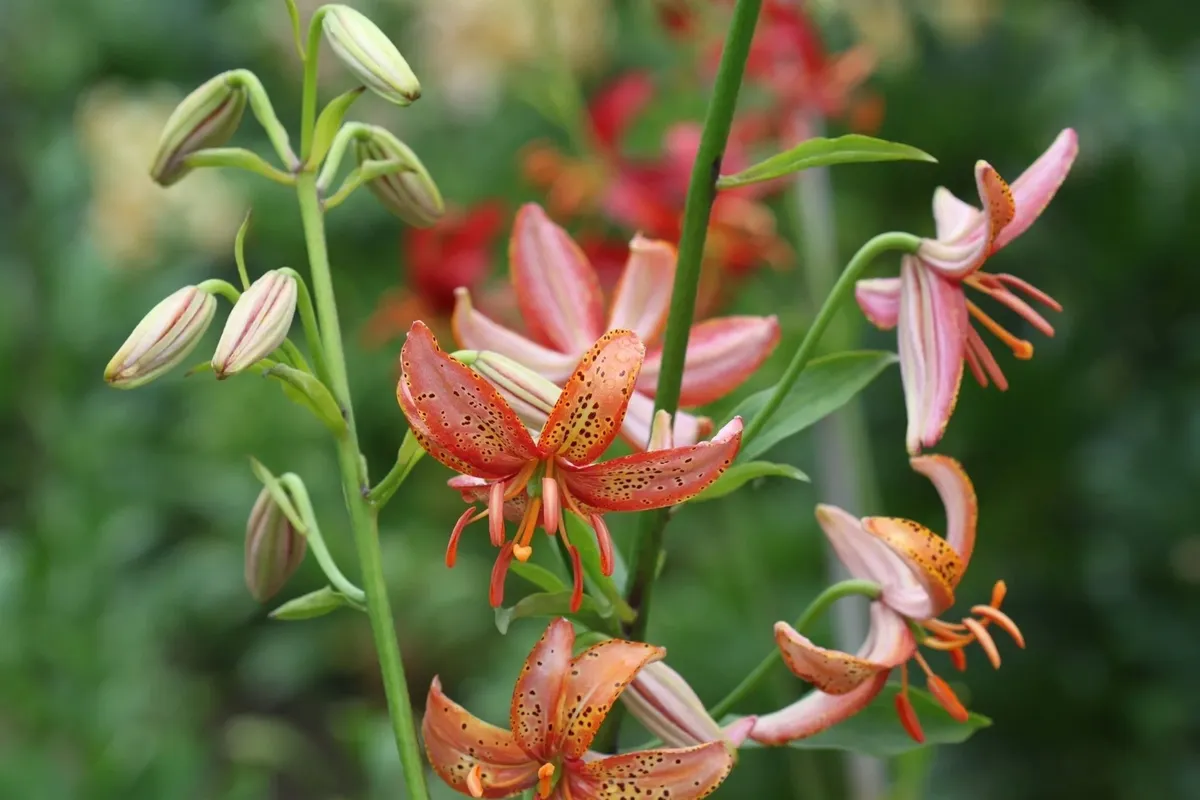 Petals 60 x 30mm, not ruffled, not recurved. Fls up-and out-facing. Lvs whorled, 150 x 40mm, dark green. Stems c 1.6m, dark green, with c24 fls.