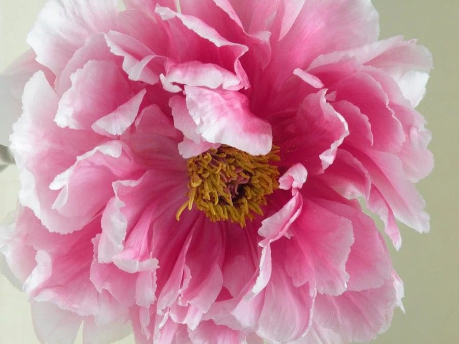 The Rou Fu Rong tree peony is known for its stunning large flowers and unique features. The flowers typically bloom in late spring to early summer. They have a very delicate and elegant appearance, with large petals that can span over 7 in diameter. The color of the flowers can vary, ranging from shades of pink. The petals often have delicate dark red markings near the center, adding to their beauty.