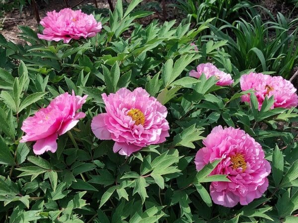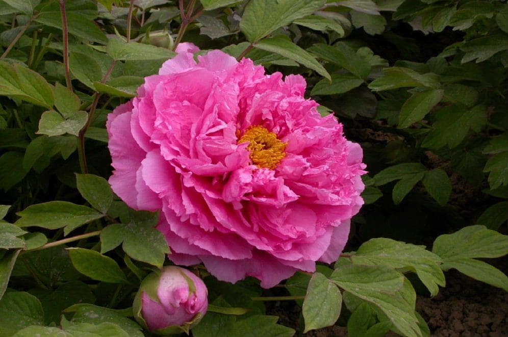 Chrysanthemum form, sometimes proliferate form occurs. Flowers 6 ½ to 7 in. Deep pink. Stalk short, flowers upright or lateral. Flowers mid-season. Medium size tree. Vigorous bloomer. Tolerant of adverse conditions and salinity-alkalinity. Bred, Heze in 1975. Please remember, No overwater of your new Tree Peony.