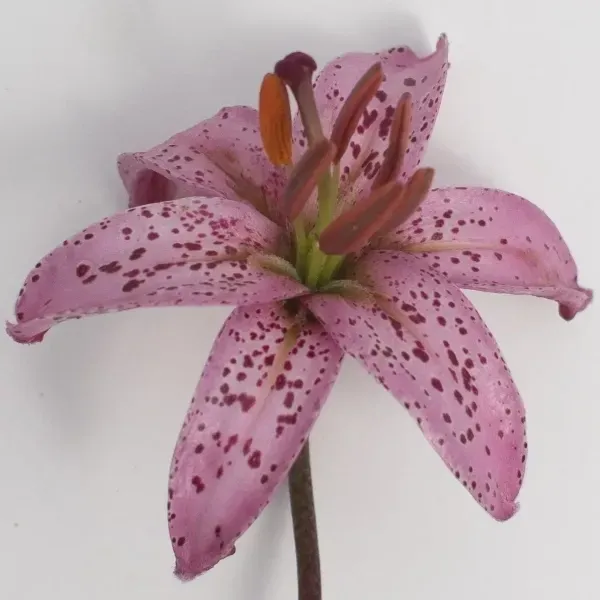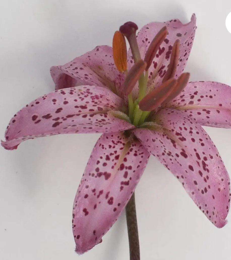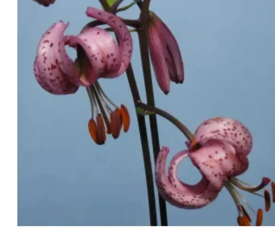 Purple Ozelot Resisted Chance Seedling Evans, E. PRE 2018 Very light purple throughout; numerous strong violet spots and ellipses over most of the tepals; frosted, pink-purple nectaries, lightly scented, slightly ruffled, strong recurve, stem is stippled purple-brown. I have not seen a lilac colored martagon and I anticipate this to be exactly what I am looking for.