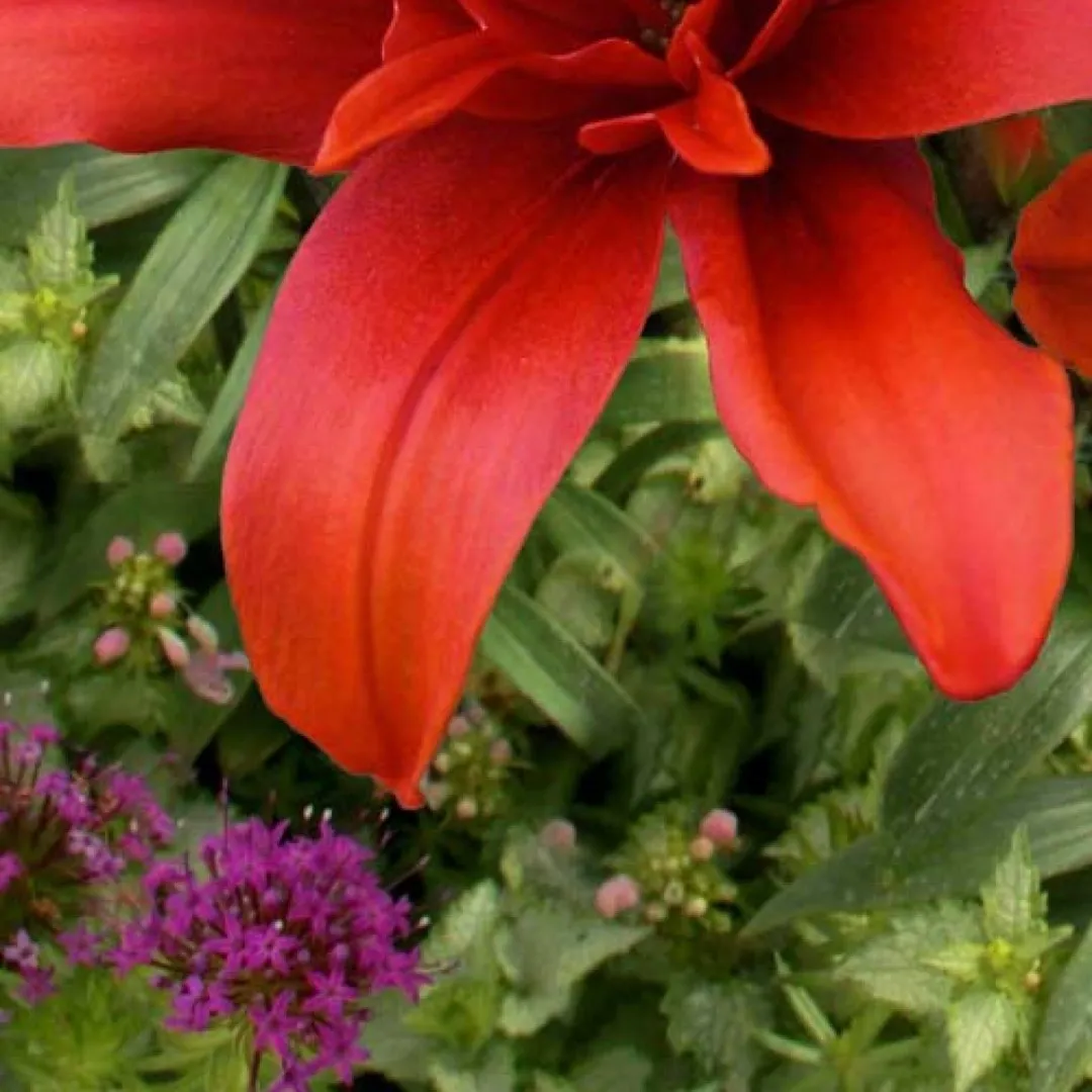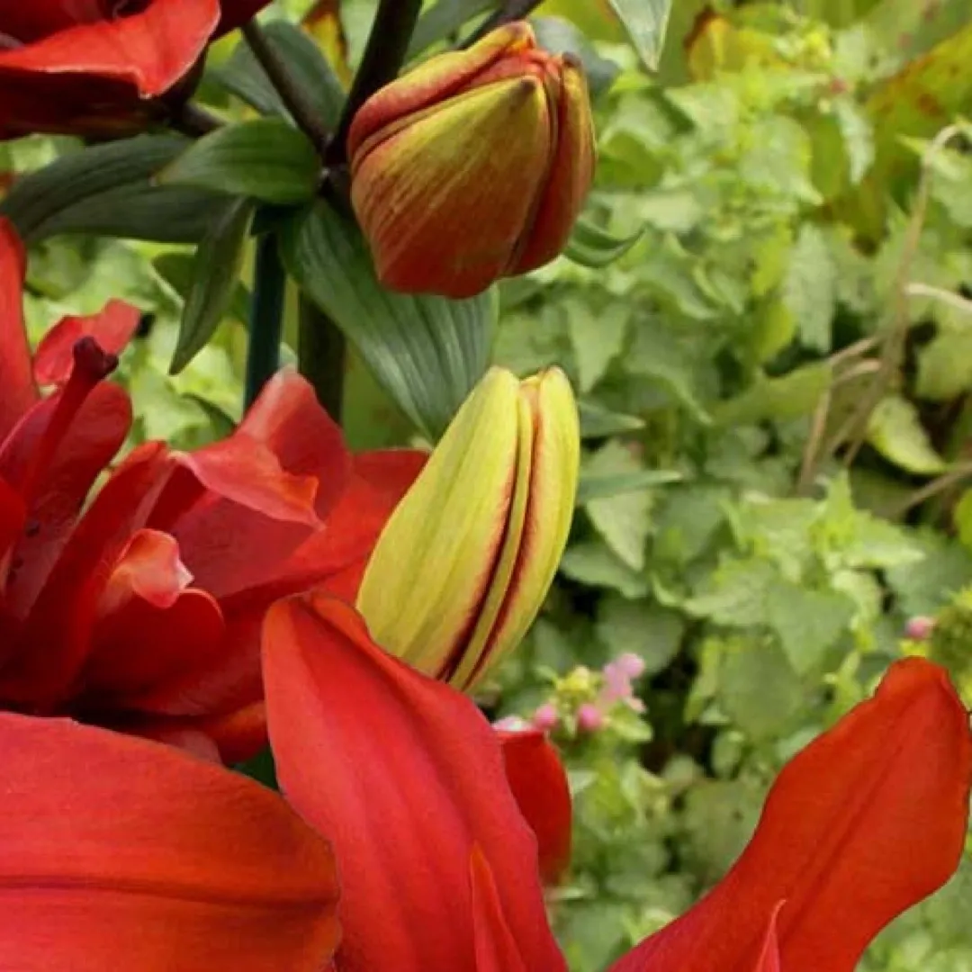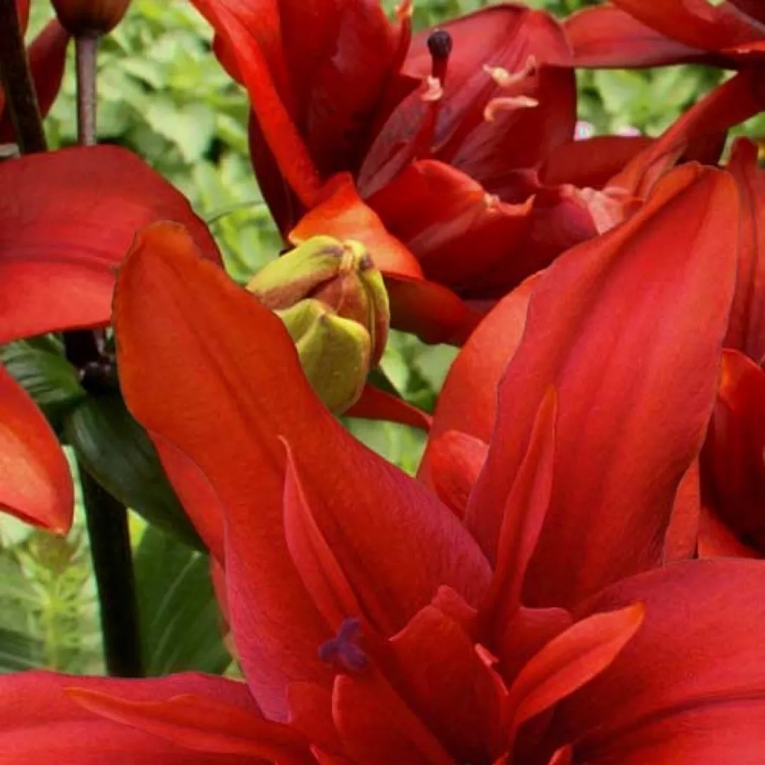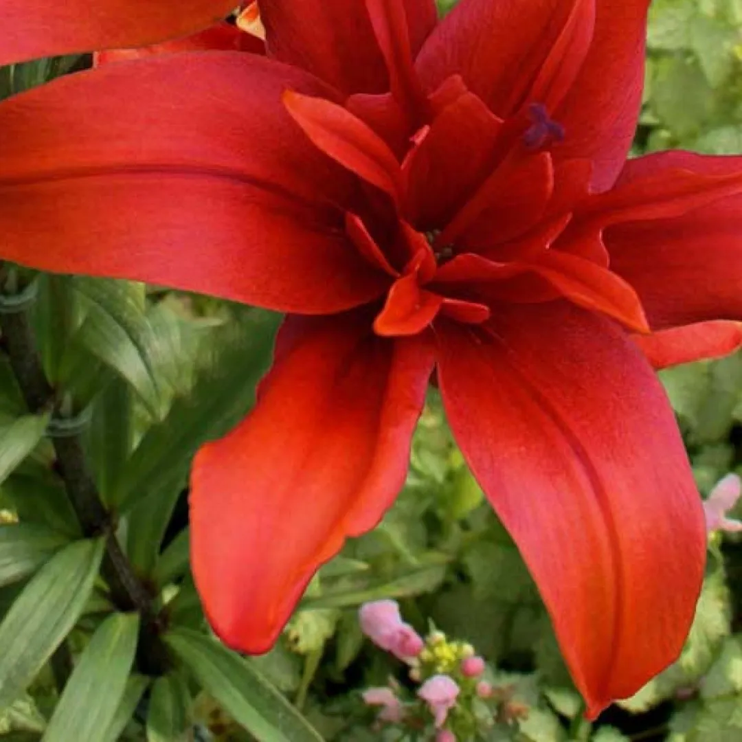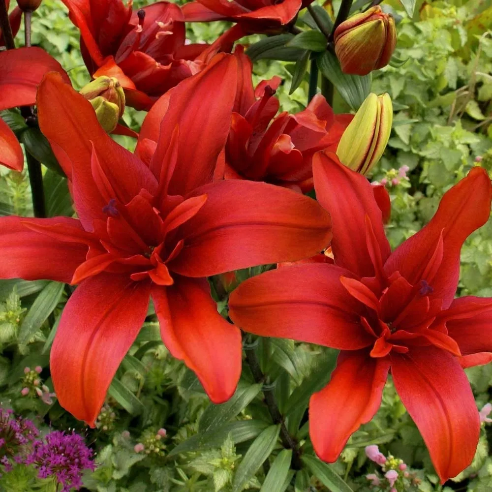 ‘Red Twin’. 6.00 or 3/15 Double Asiatic adds a whole new dimension of texture in your gardens with the unusual character of a ‘fluffy’ looking Lily. This particular asiatic is pollen less. The showy outer petals actually frame a miniature inner blossom. Rich Red-Orange double 4 inch blossoms face upward as they greet the nearby gazers. A lovely addition for the gardens to behold.