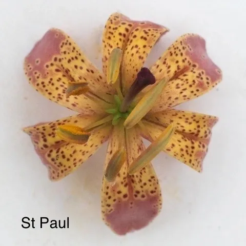 St.Paul is a dusty mauvelous pink with a arrangement of city lights and dark shadows. The trademark of the thumbprint tips adds to the charm of the tightly curled tepals. I have many within the gardens but only few this season.
