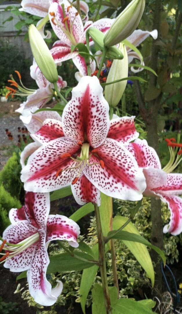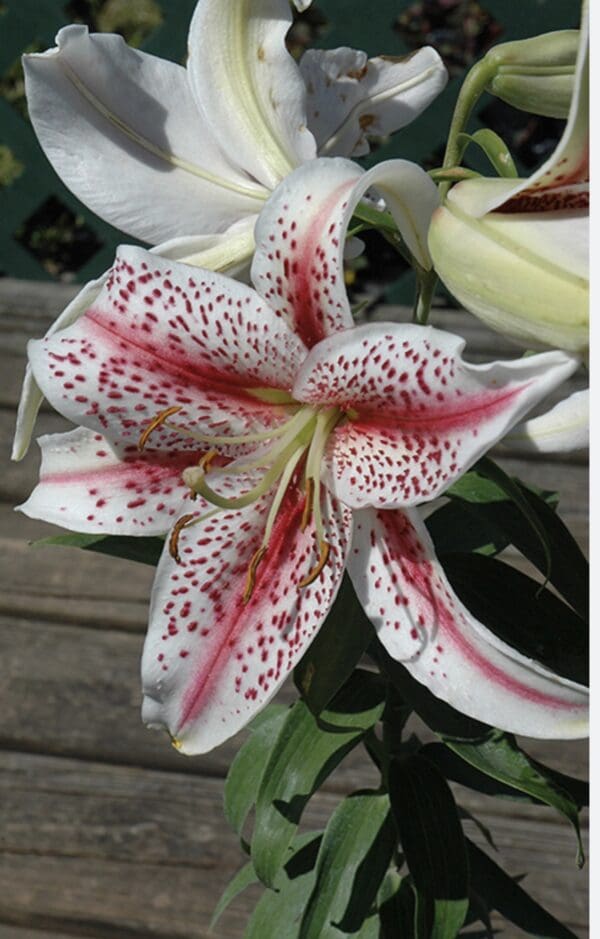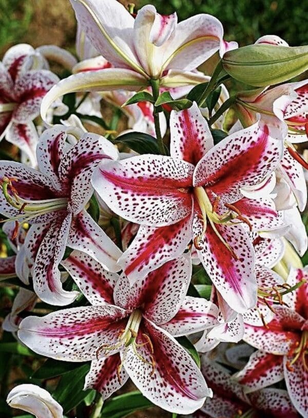 ‘Tigerwoods’ is a clean white blossom that has a flaunting of burgundy freckles and stripes that borne atop thick, rigid stems. This is rather an amazing blossom with its abundant of buds and fragrance all packed for a power display. Truly a kaleidoscope of beauty and splendor that mimics a pinwheel of events within the gardens.