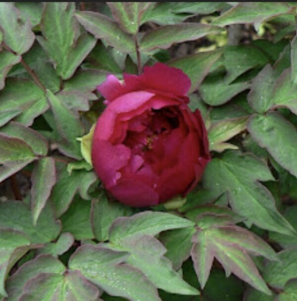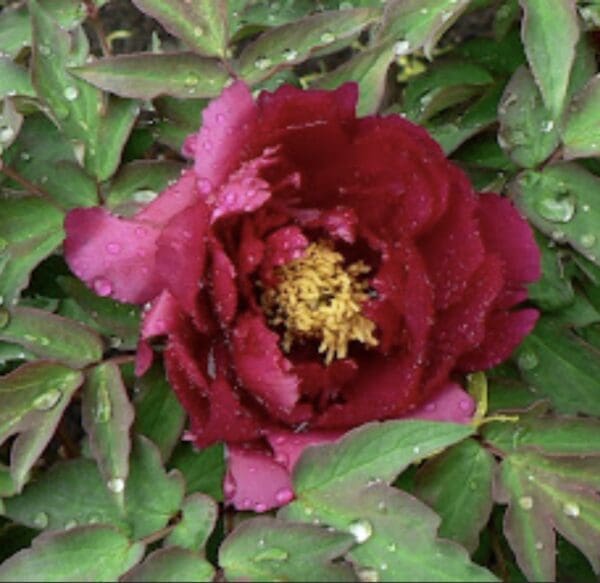 The buds form soft and gentle, looking like noting is going to unfold, and then— Just like that——- The bloom emerges in splendor. The powerful thick petals toss a spicy softness in the density of the moist air. The breeze carries silvery bloom that reflect to cast shadows of freedom. The sacred glossy (ness) becomes a rare delight for some to witness if they have a chance to get within the site of the ever moving transformation of the changing color of its foliage. ‘Wu Jin Hui’ truly is a Glossy Tree Peony and has one-of-a-kind genetics.
