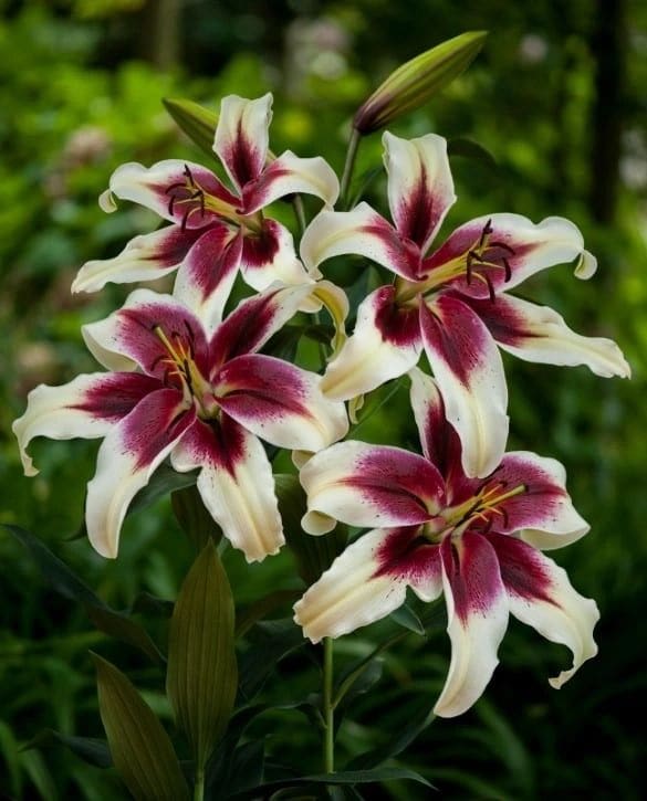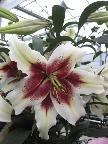 Bringing this one back as I have had lots of request, Limited supplies Zeba was one of the very first introductions out of ‘Kushi Maya.’ K.M. is a cross that came from L. nepalense and an Oriental. Zeba was the result of K.M. crossed back to yet another Oriental. WOW WOW … I LOVE IT. The flowers are huge and have a delightful fragrance. The ‘splat’ of burgundy plum within the center makes this make you stop dead in your tracts and just look at it. I have a very limited amount of these. Rare-plant enthusiasts have long attempted to grow Nepal lily. With these new hybrids we are finding a very reliable dependable lily for the gardens. This is not a species